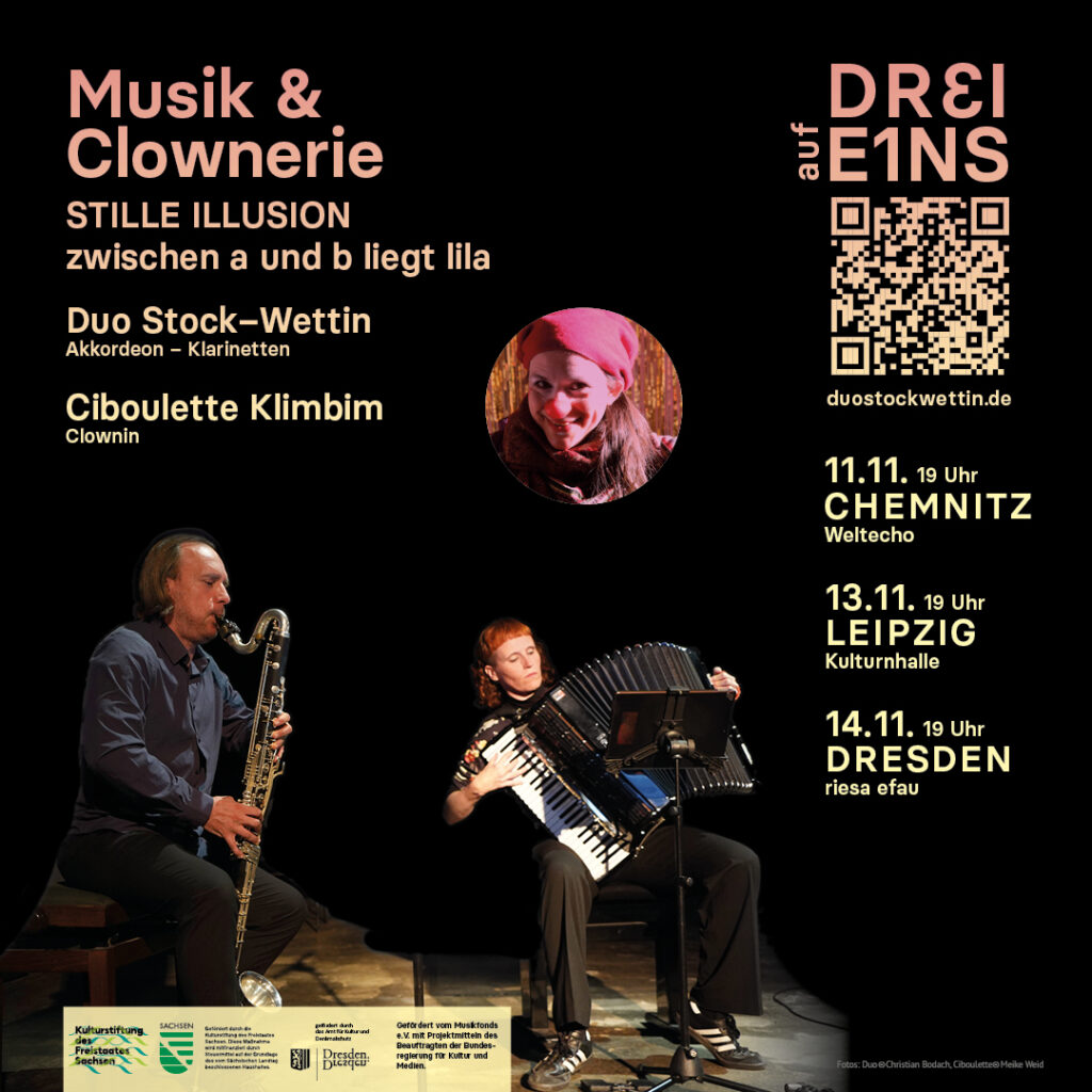 Das Duo Stock-Wettin lädt im November zu seiner experimentellen Konzertreihe DREI AUF EINS nach Chemnitz, Leipzig und Dresden ein. Susanne Stock (Akkordeon) und Georg Wettin (Klarinette) haben diesmal die französische Clownin Yaëlle Dorison mit ihrer Figur Ciboulette Klimbim zu Gast.